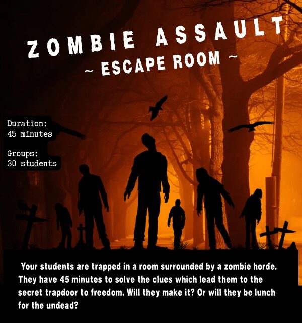 Each year, the escape room features a new theme and antagonist, brought to life by a native English-speaking actor. Students must interact with the facilitator, follow instructions, and work together to succeed.